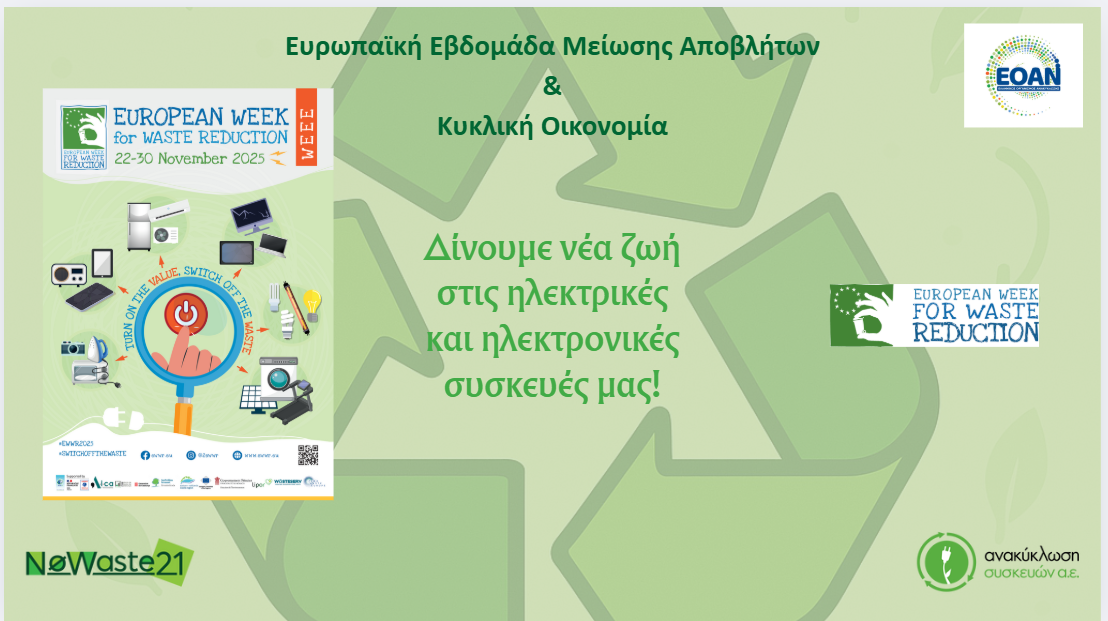 Η NoWaste21 συμμετέχει και φέτος με δράσεις στην Ευρωπαϊκή Εβδομάδα Μείωσης Αποβλήτων (22-30 Νοεμβρίου)ewwr.gr η οποία για φέτος είναι αφιερωμένη στη μείωση και πρόληψη αποβλήτων ηλεκτρικού και ηλεκτρονικού εξοπλισμού (ΑΗΗΕ). Οι δράσεις πραγματοποιούνται σε σχολεία που υλοποιείται το εκπαιδευτικό πρόγραμμα Κυκλικής Οικονομίας και έχουν ως στόχο οι μαθητές να ενημερωθούν και να ευαισθητοποιηθούν για την σωστή διαχείριση των αποβλήτων των ηλεκτρικών και ηλεκτρονικών συσκευών και με όχημα την φαντασία τους να εκφραστούν και να δημιουργήσουν έργα σχετικά με το θέμα της φετινής ευρωπαϊκής εβδομάδας.
