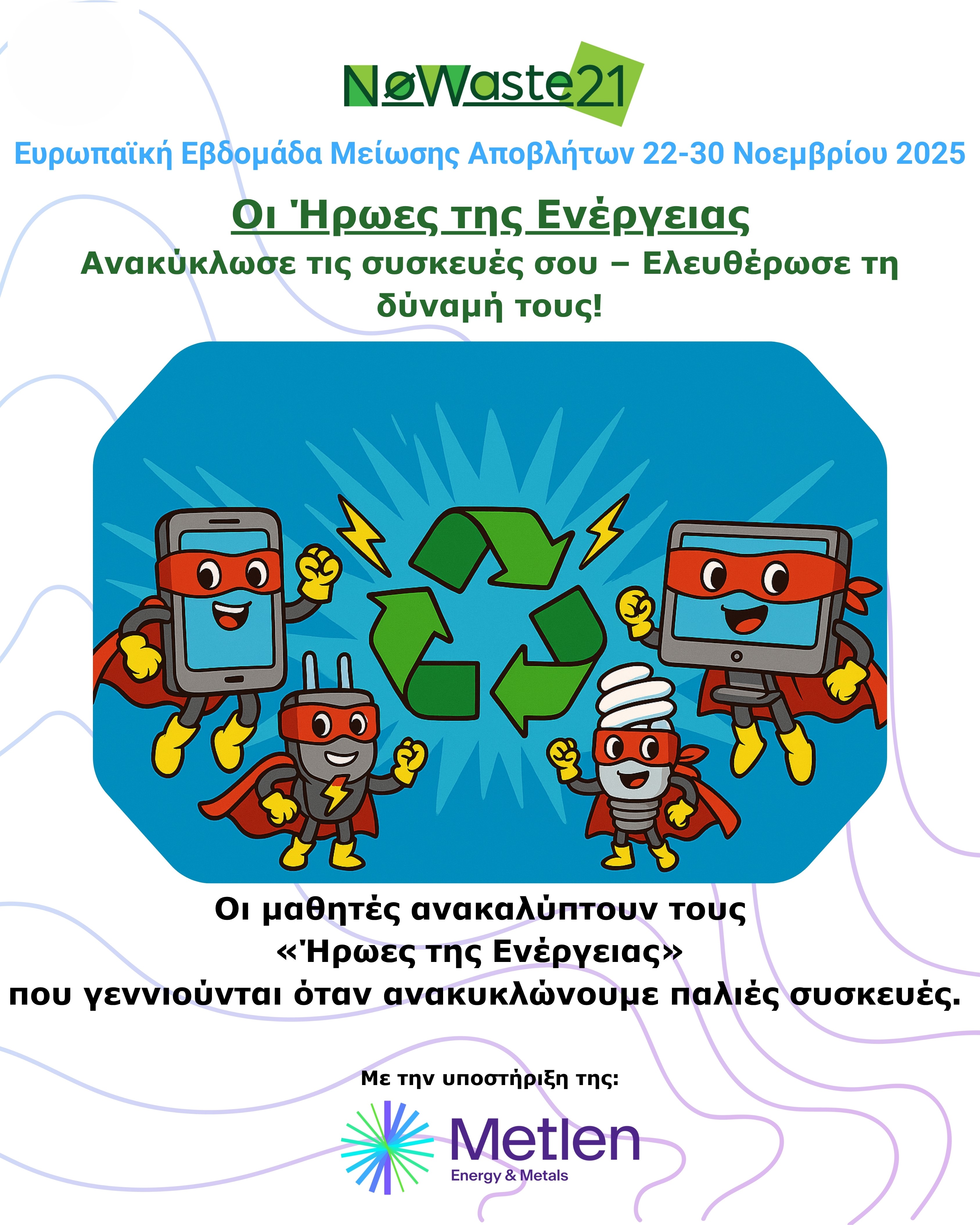- Η ΝοWaste21 σε συνεργασία με την Μetlen Energy & Metals πραγματοποιούν δράση στο πλαίσιο των εκπαιδευτικών παρουσιάσεων Κυκλικής Οικονομίας που υλοποιούνται στις Περιφέρειες Βοιωτίας & Μαγνησίας, Πελοποννήσου και απομακρυσμένων περιοχών. Με σύνθημα ''Οι 'Hρωες της Ενέργειας'' τα σχολεία καλούνται να δημιουργήσουν ευφάνταστα έργα με θέμα τις Ηλεκτρικές και Ηλεκτρονικές Συσκευές τα οποία θα οπτικοποιηθούν σε ψηφιακό υλικό και θα γίνει διάχυση στα social media.