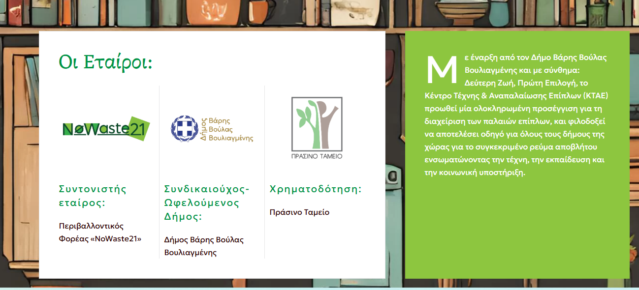 Το έργο με τίτλο «Λειτουργία Κέντρου Τέχνης & Αναπαλαίωσης Επίπλων (ΚΤΑΕ) στον Δήμο Βάρης Βούλας Βουλιαγμένης» αποτελεί μια καινοτόμα πρόταση επαναχρησιμοποίησης επίπλων και δημιουργίας έργων τέχνης, η οποία χρηματοδοτείται από το Πράσινο Ταμείο στο πλαίσιο της Πρόσκλησης «Καινοτόμες δράσεις με τους πολίτες» του χρηματοδοτικού προγράμματος «Φυσικό Περιβάλλον & Καινοτόμες Δράσεις 2023», όπου συμμετείχε λαμβάνοντας την 6η θέση μεταξύ 71 υποψηφιοτήτων.