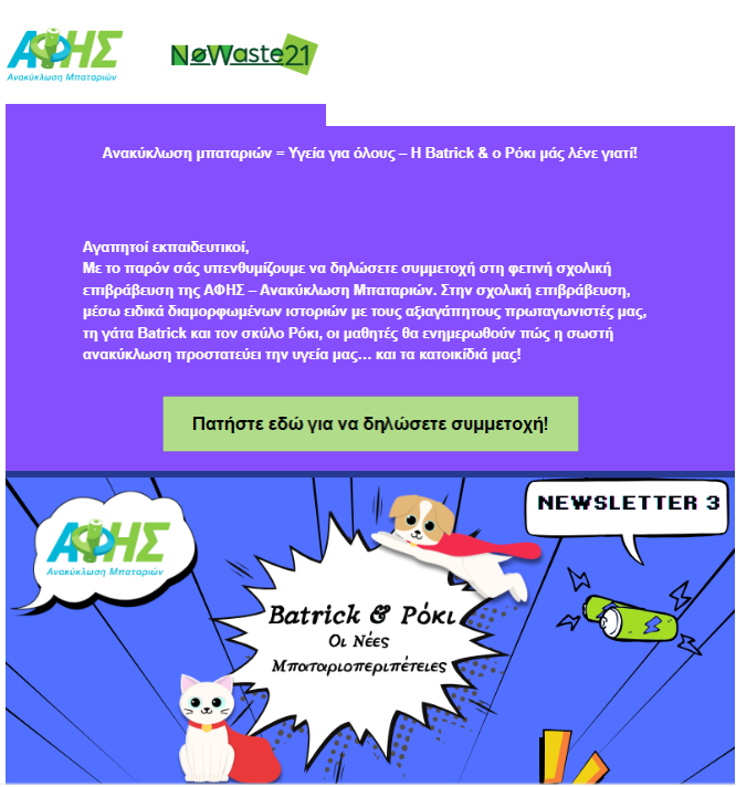 Το 1ο Newsletter έχει ήδη σταλεί στα σχολεία και για φέτος οι ήρωες που θα μας συντροφεύσουν στο ταξίδι της ανακύκλωσης των μπαταριών είναι η Batrick και ο Ρόκι που θέλουν να βοηθήσουν τους μαθητές να σώσουν τον κόσμο!